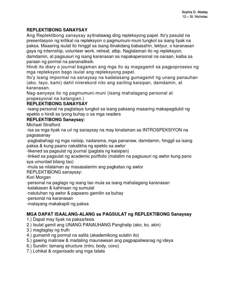Mga Dapat Isaalang Alang Sa Pagsulat Ng Replektibong Sanaysay 1 Magkaroon Ng Course Hero Ako at ang aking pamilya ay nag swimming kung saan kami ay magkakasamang nagtanghalian. Mga Dapat isaalang-alang sa Pagsulat ng Replektibong Sanaysay Gumamit ng pormal na salita. Mga Dapat Isaalang-alang sa Pagsulat ng Replektibong Sanaysay.