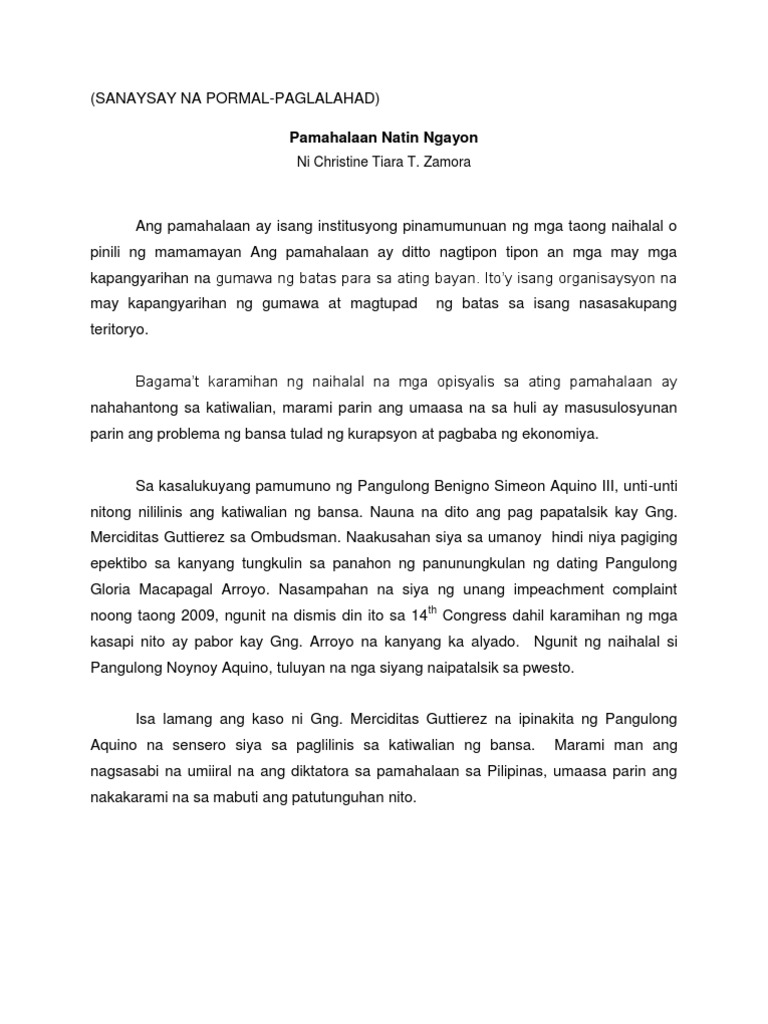 Sulating Di-pormal o Impormal Ang mga sanaysay na impormal o sulating di-pormal ay karaniwang nagtataglay ng opinyon kuru-kuro at paglalarawan ng isang may akda. Ang economic output ng Pilipinas na sinusukat sa pamamagitan ng Gross Domestic Product ay bumaba ng 02 noong unang quarter ng 2020. Dahil na din yan sa pagkakaisa ng mga Pilipino at pamumuno ng mga nasa mataas na posisyon.