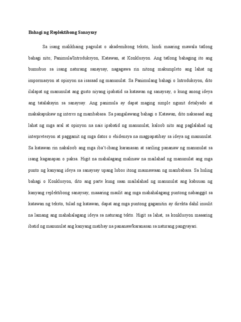 Sanaysay kahulugan mga uri at mga bahagi nito. Ang katawan ng replektibong sanaysay ay naglalaman ng malaking bahagi ng salaysay obserbasyon realisasyon at natutuhan. Tatlong Bahagi o Balangkas 1.