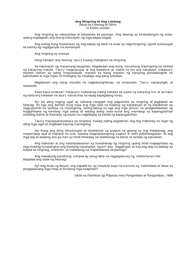 Ningning at liwanag ni emilio jacinto. Ng mga Espanyol sa bansa ng itoy isinulat ng may-akda. He provides an analysis of the text and interprets Jacintos challenge to leaders of the Philippines in our current context. Ang sanaysay ni Emilio Jacinto na Ang Ningning at ang Liwanag ay nagpapakita sa.