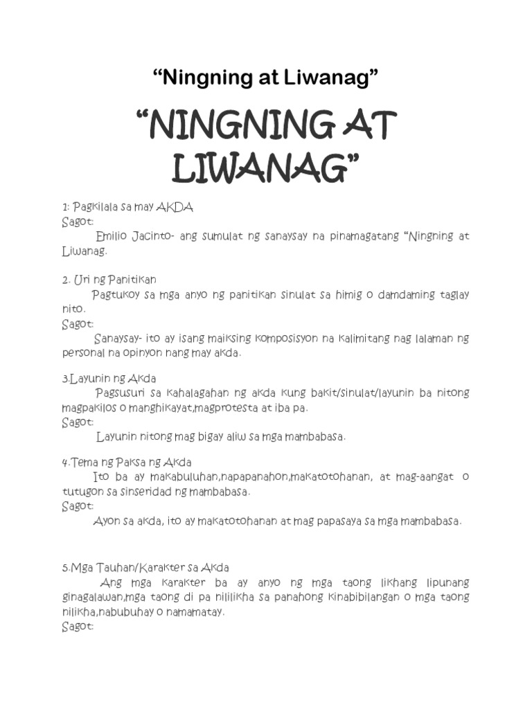 Ningning at liwanag sanaysay. Anu ang pangunahing kaisipan sa sanaysay na ningning at liwanag. Emilio Jacinto Ang ningning ay nakasisilaw at nakasisira ng paningin. Ito rin ang proseso ng koleksyon ng imahe ang sining ng produksyon na nagpapalipat-lipat sa ideya ng.