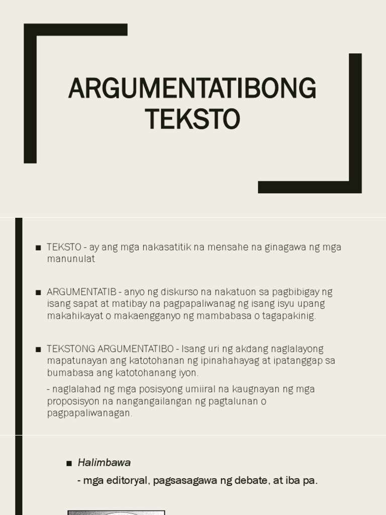 622018 Pagsusuri sa Tekstong Argumentatibo. Kung nagsusulat ka ng isang argument na argumento maaari mong buuin ang iyong sariling tesis sa paligid ng istraktura ng mga pahayag sa itaas.
