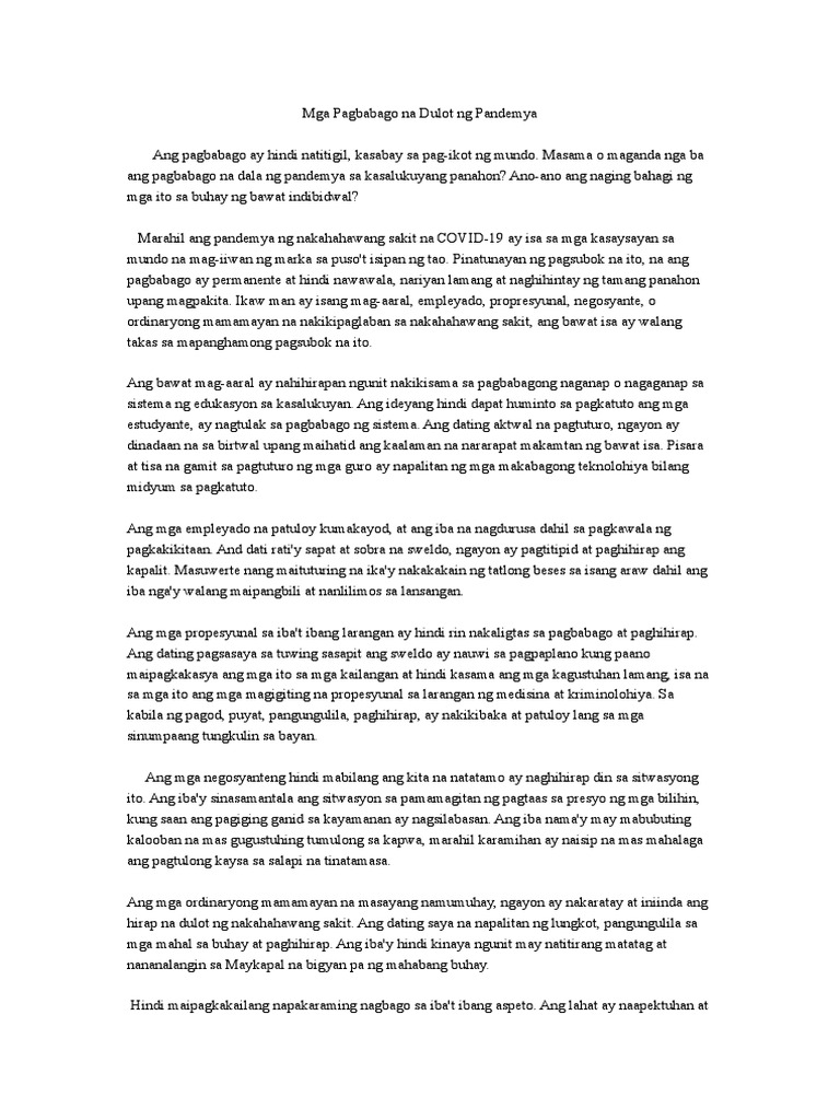 Bagamat ang malaking hamon dulot ng pandemya ay nagbigay ng pag-asa pagmamahal at pananampalataya sa panahon sa ating lahat. Ang ating buhay ay hiram lamang sa panginoong may kapal kayay lubos nating pahalagahan at pangalagaan. Sanaysay sa Pandemya Sa loob ng anim na buwan binago ng COVID-19 pandemya ang mundo.